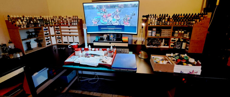 Après toutes ces années, j'ai eu l'occasion de me rendre compte qu'avoir un poste de travail propre et bien organisé était un atout majeur afin de progresser dans la peinture sur figurine. Je me suis donc conçu mon poste de travail idéal afin de me faciliter la vie au maximum.
